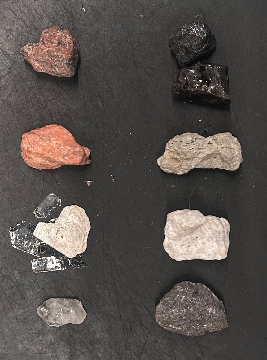 Quartz, Mica, Feldspar (those three combine to make Granite), Granite.